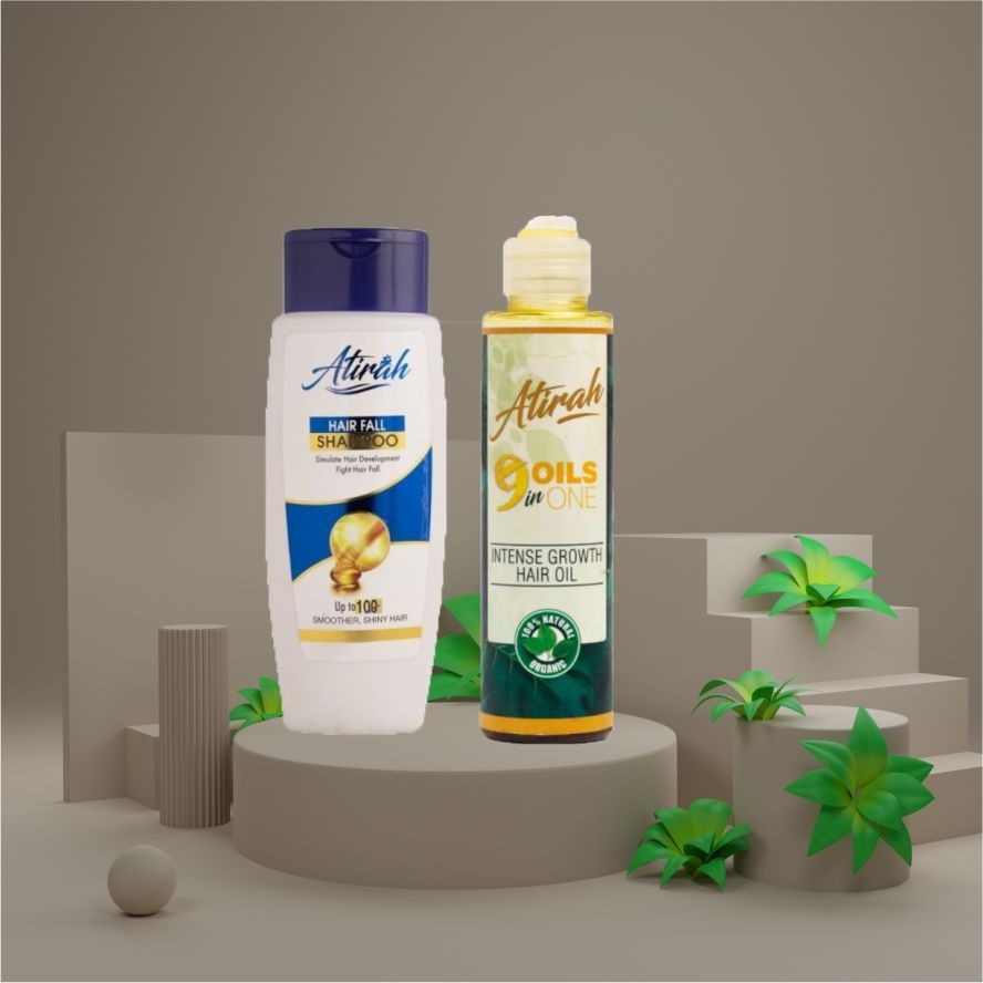 Atirah Combo Deal, featuring Anti-Defense Hair Fall Shampoo (200ml) and 100% Organic 9-in-1 Hair Growth Oil (120ml). This powerful duo helps reduce hair fall, repair damage, control dandruff, and promote long, smooth, and healthy hair for men and women.
